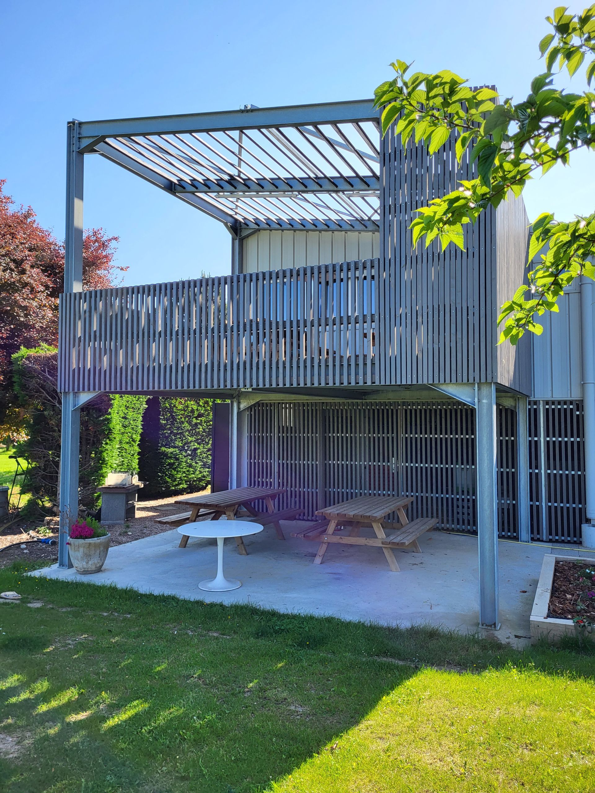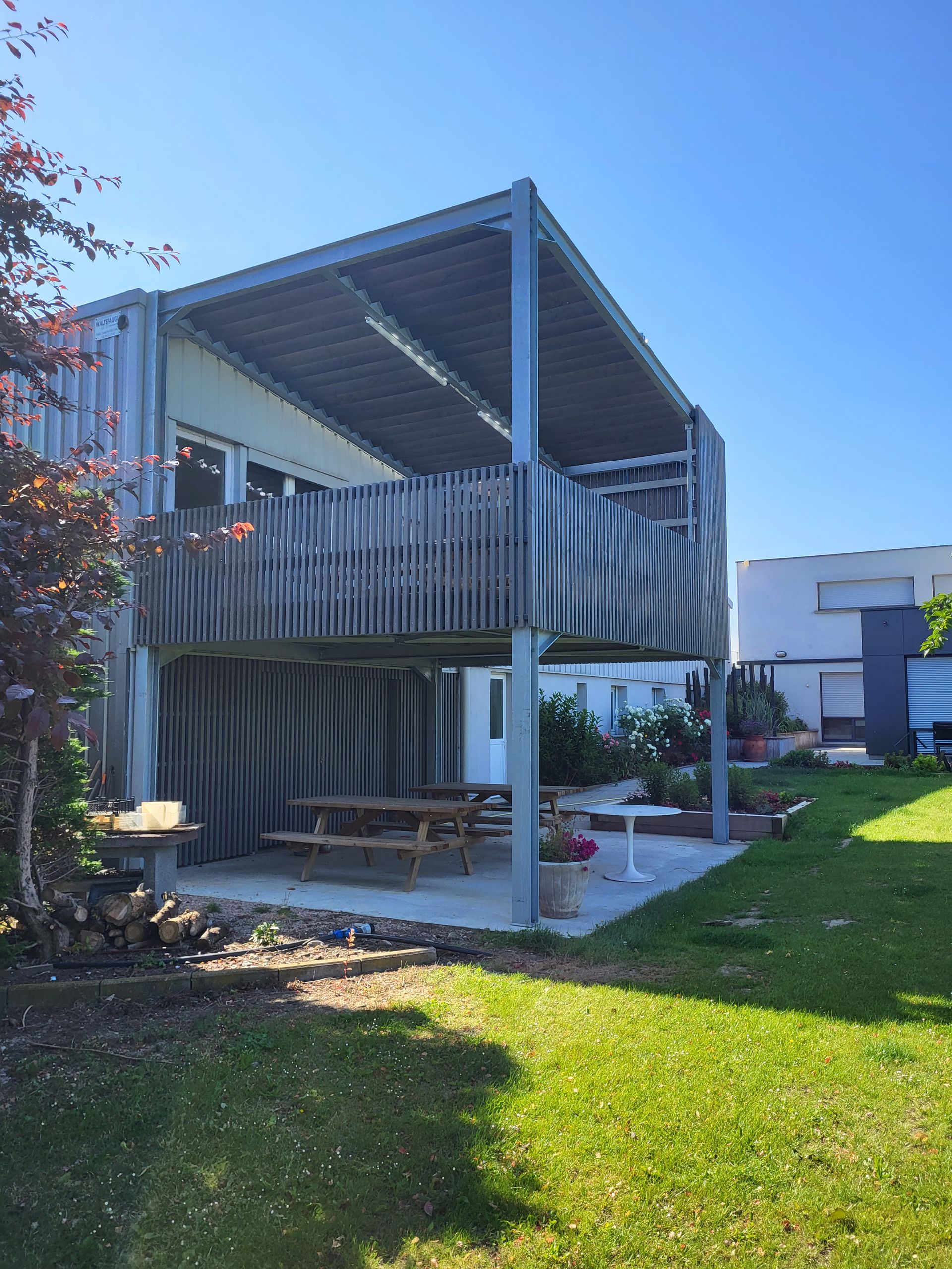 Une terrasse sur pilotis, en métal galvanisé pour qu’elle ne subisse pas les dommages du temps et du climat. (rouille…)